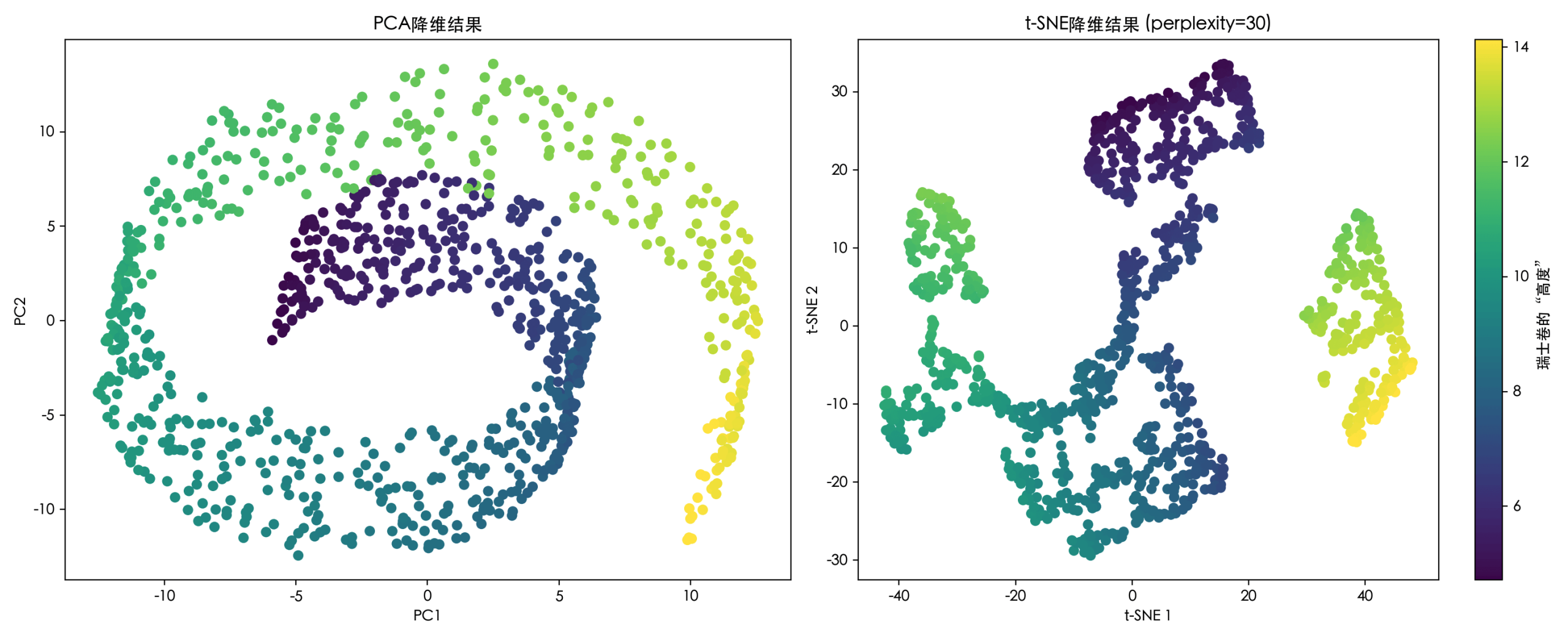 perplexity参数:可以理解为对每个点考虑多少个近邻。值小则更关注局部结构,值大则更关注全局结构。它是t-SNE最重要的调参对象。random_state:确保结果可复现,因为t-SNE的优化过程是随机的。- 从可视化结果可以清晰看到,PCA将瑞士卷"压扁"了,丢失了其非线性卷曲结构;而t-SNE则更好地在二维平面上展开了这个卷,保留了数据的局部邻接关系。