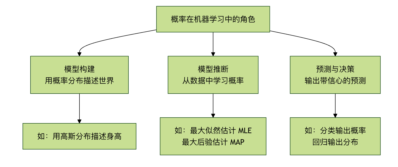 概率思维渗透在机器学习的各个环节,主要扮演以下三种角色: