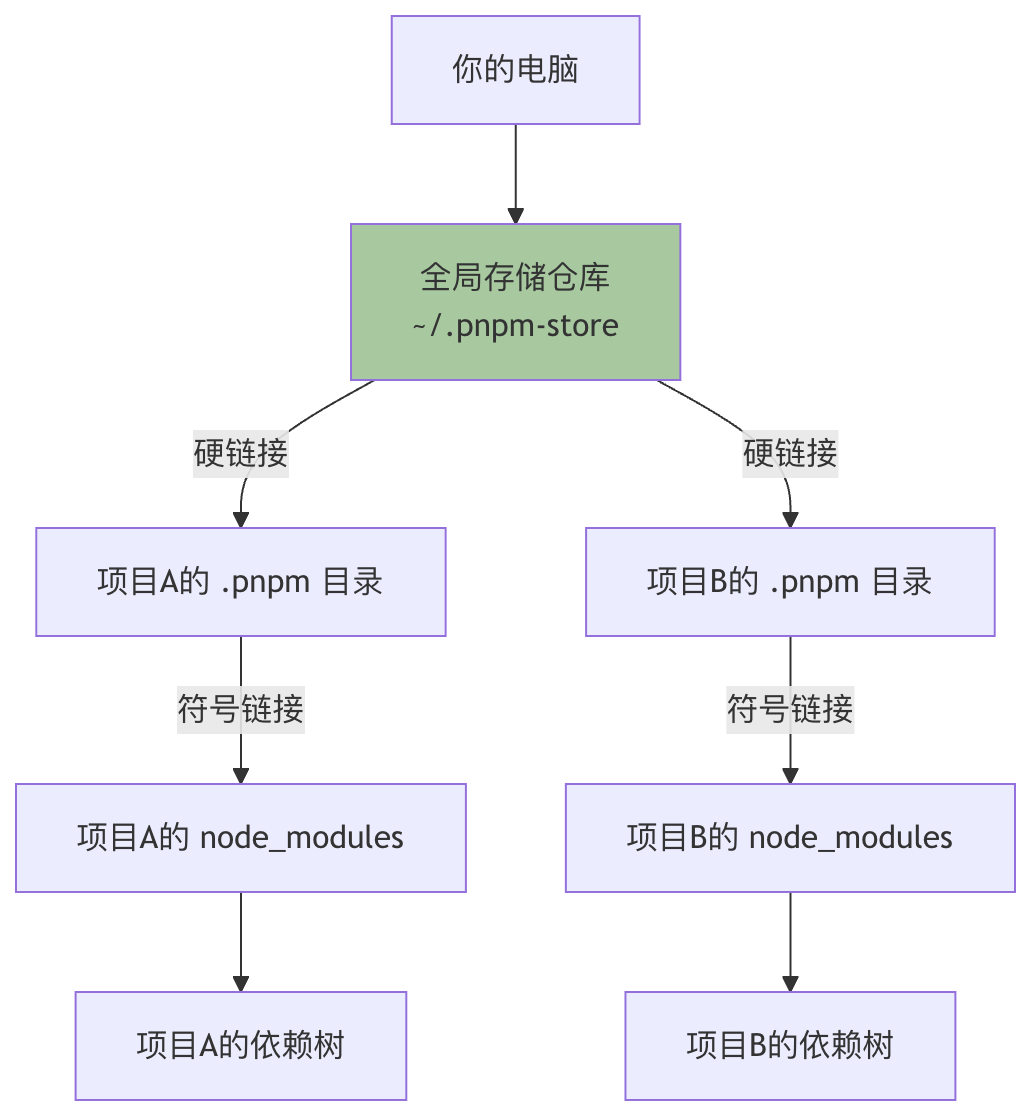 ~/.pnpm-store)。 - 硬链接:在你项目的