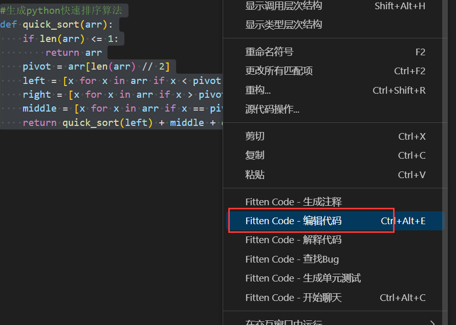 Fitten Code 可根据用户指示对选定的代码块进行编辑。通过选中代码段右键选择 "Fitten Code — 编辑代码" ,如下图所示:
