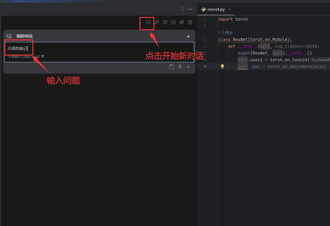 用户可通过点击左上角工具栏中的 Fitten Code — 开始新对话打开对话窗口进行对话: