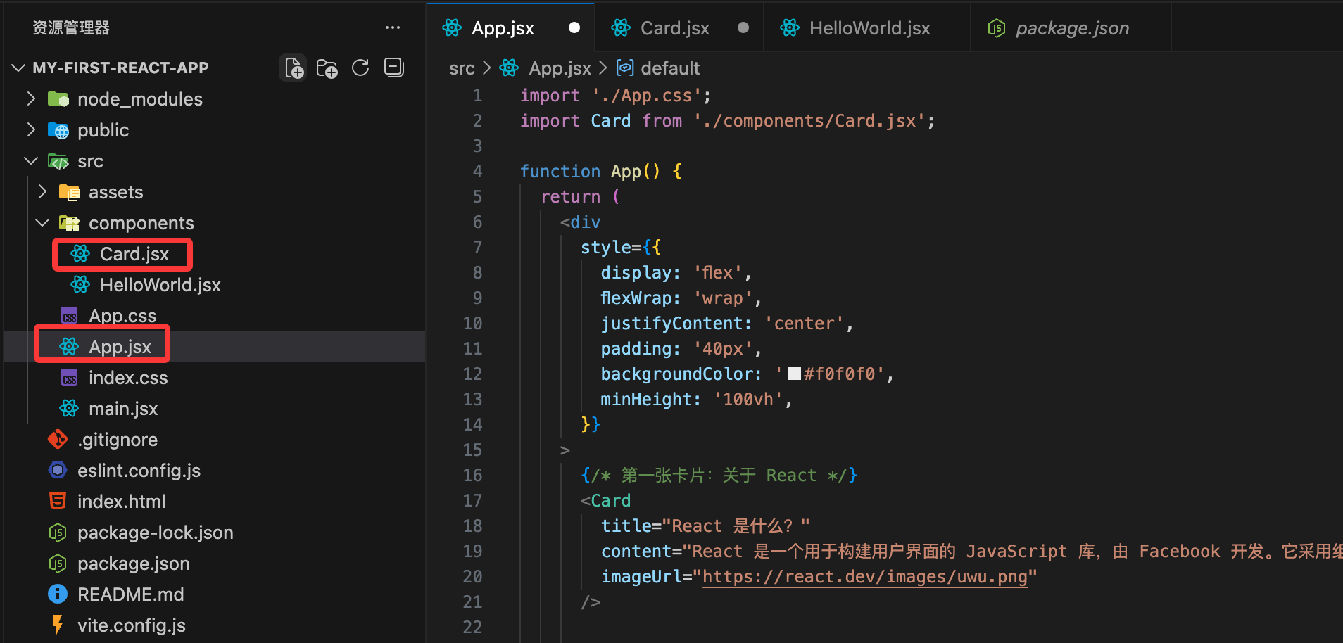 打开 src/App.jsx,替换内容为以下代码(保留了原来的部分结构,清理了默认计数器,专注于卡片展示):