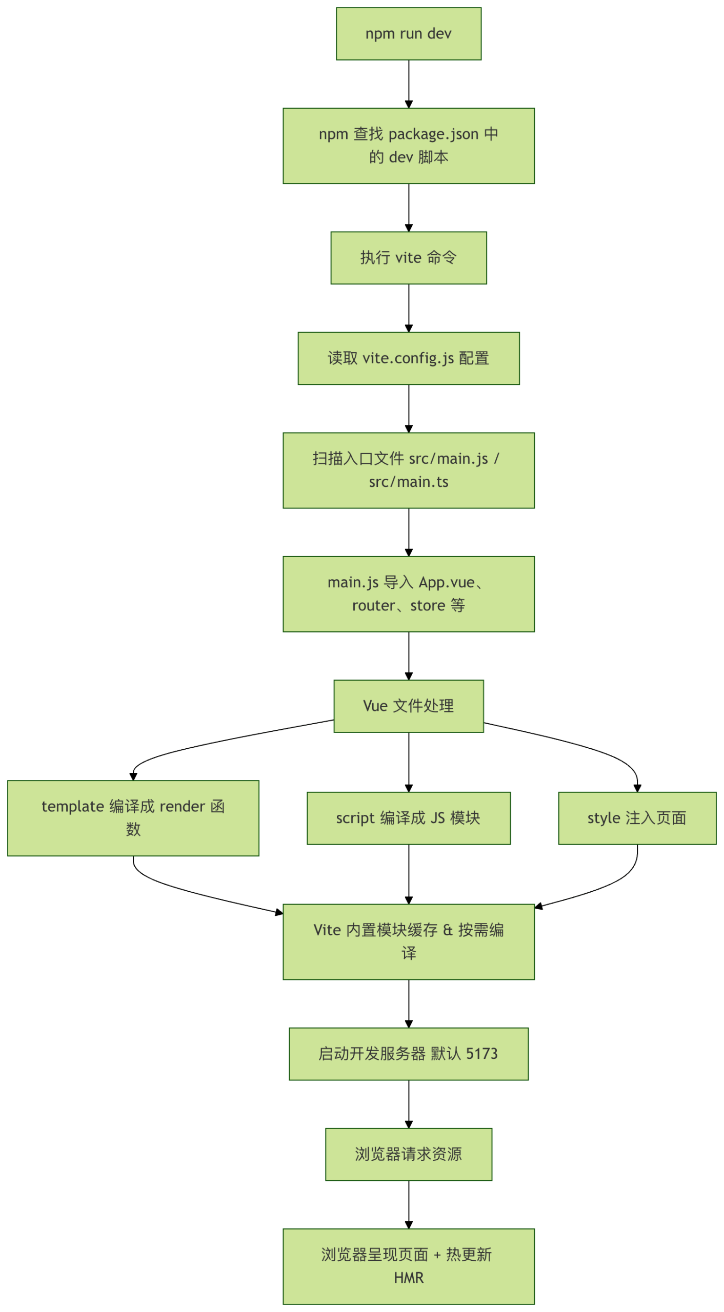 执行 npm run dev 命令后,npm 会查找本地 node_modules/.bin/vite 可执行文件,调用这个文件,启动开发服务器。